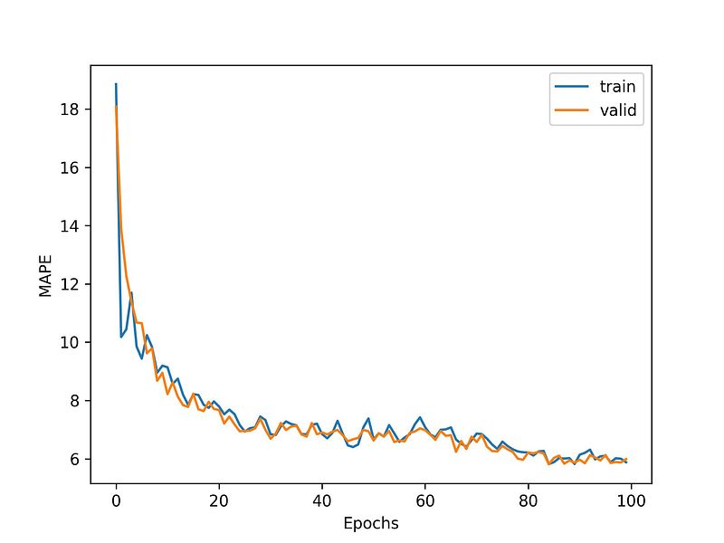 MAPE (mean absolute percentage error) in % for prediction in Houston city over training and validation.