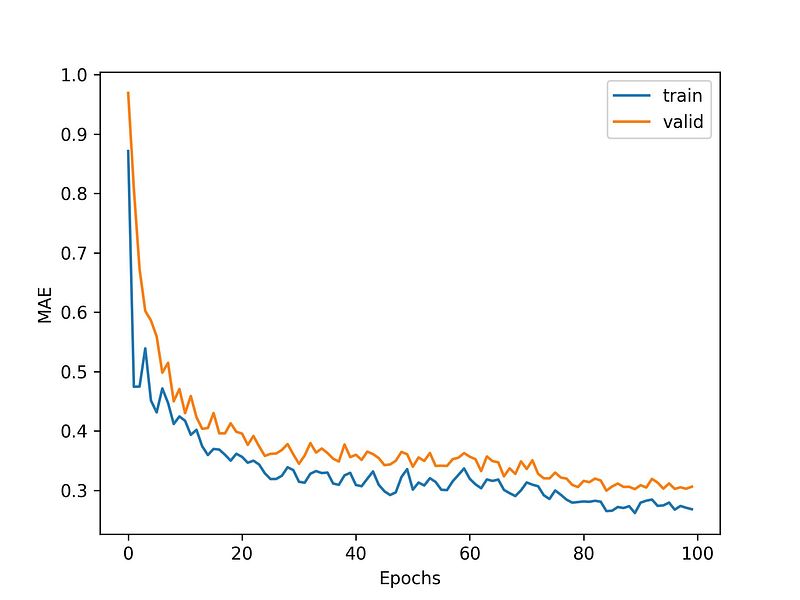 MAE (mean absolute error) of prediction in Houston city over training and validation.